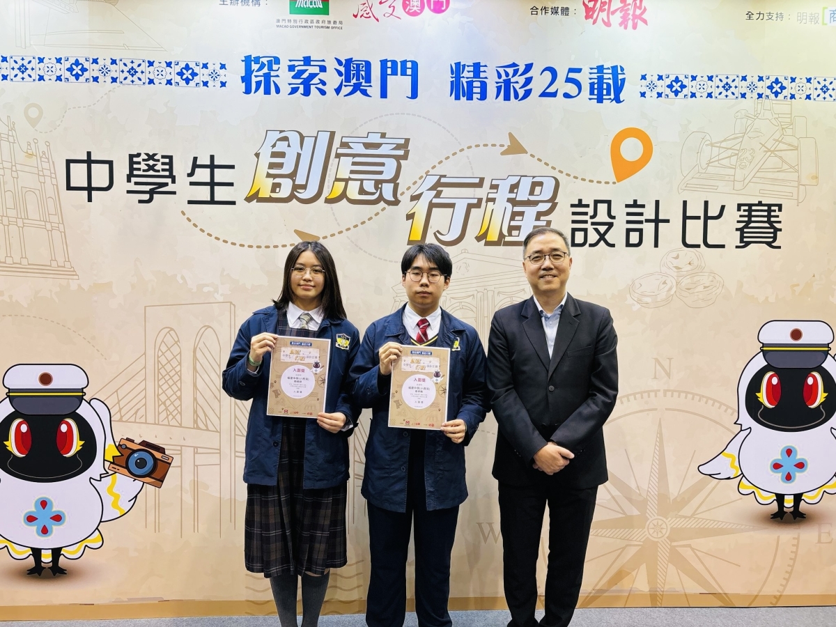 本校旅款科蔡承翰和賴曉姸同學於2月22日參加「中學學生創意行程設計比賽」。他們參與了澳門交流活動,並在製作展板環節中進入決賽,取得優異成績。從3月13至16日,他們的作品會在香港旅遊博覽會展示。